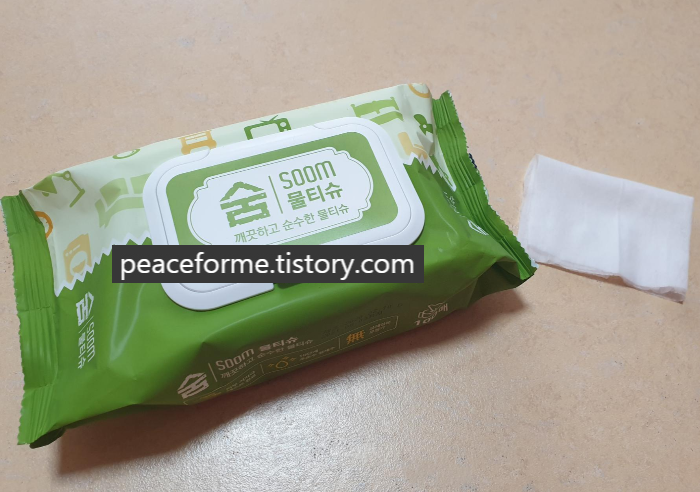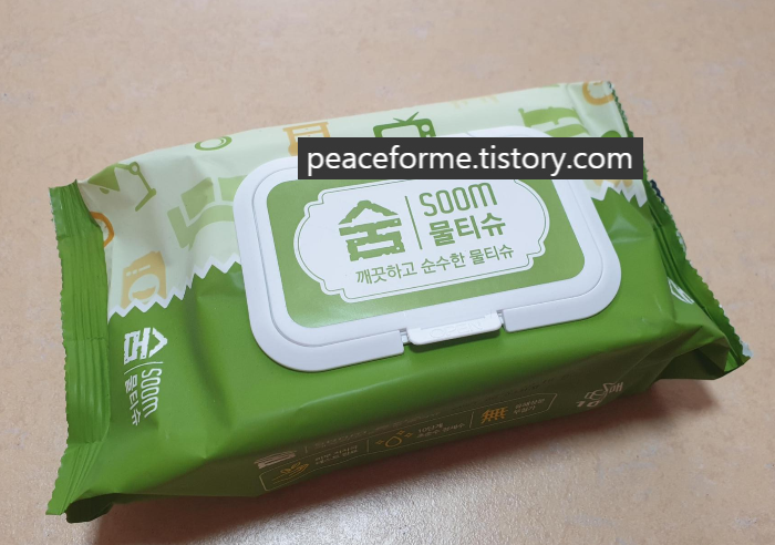 깨끗하고 순수한 물티슈를 표방하는 숨(SOOM) 물티슈는 한 팩에 100매가 담겨 있어 넉넉한 양을 자랑함과 동시에 저자극 상품이라는 사실도 장점으로 다가왔다. 게다가 패키지 컬러 디자인이 그린 컬러를 중심으로 이루어짐에 따라 자연의 싱그러움을 머리 속에 떠올리게 해주는 점이 마음에 들었다.