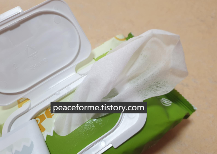 한 손을 쓱쓱 움직여서 물티슈를 밖으로 빼는 일이 그리 어렵지 않았다. 뿐만 아니라 과하지 않은 수분감으로 촉촉함을 전해주는 점도 꽤 괜찮았다.