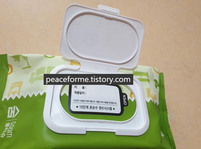 그리고 다시, 숨 물티슈 앞부분에 부착된 캡을 열면 접착 스티커가 붙여진 내부의 모습을 확인할 수 있게 된다. 이름과 함께 개봉일자를 쓸 수 있는 눈에 쏙 들어왔고, 안전한 사용을 위해 개봉 후 1개월 이내의 사용을 권장한다는 내용도 물티슈를 꺼낼 때마다 마주하도록 해줘서 감명깊었다.