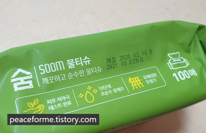 피부 저자극 테스트를 완료했고, 10단계로 구성된 초순수 정제수를 사용했으며, 유해성분이 첨가되지 않음으로써 안심하고 쓸 수 있게 만들어졌다고 해서 더 신뢰가 갔던 숨 물티슈였다. 참고로 제조기간은 2020년 2월, 유통기한은 2021년 8월까지라서 올해 상반기까지 부담없이 쓰기에도 충분하다는 생각이 들었다.