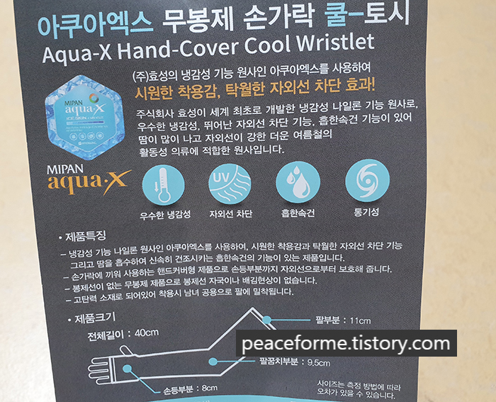 손등부터 팔의 윗부분까지 이어지는 총 길이는 40cm에 달하며 손등 부분은 8cm, 팔꿈치 부분은 9.5cm로 구성되어 있으니 참고해서 구매를 고려하면 되겠다. 사이즈는 측정 방법에 따라 오차가 있을 수 있다는 점을 감안해서 말이다. 일단 나의 경우에는 손등까지 덮어주는 길이감과 자외선 차단 및 냉감성의 기능을 고루 갖추었음을 확인하게 돼 구입을 망설이지 않았다.