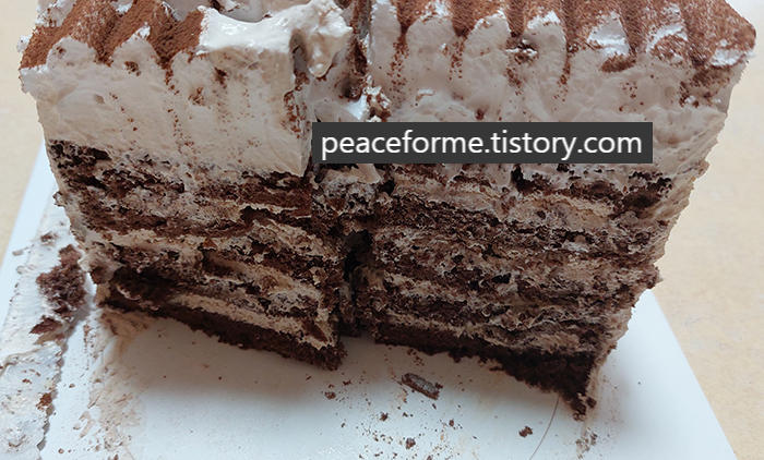 그리하여 맛을 보고자 커팅을 통하여 만나 본 뚜레쥬르 향긋한 밀크티 라떼 케이크의 단면은 기대 이상이었다. 초콜릿 케이크 시트가 무려 5장이었던 데다가 얼그레이 생크림이 풍성하게 채워져 있어 보는 것만으로도 입이 쉽사리 다물어지지 않았다. 게다가 맨 윗부분을 장식한 생크림의 양 또한 어마어마해서 깜짝 놀랐다.