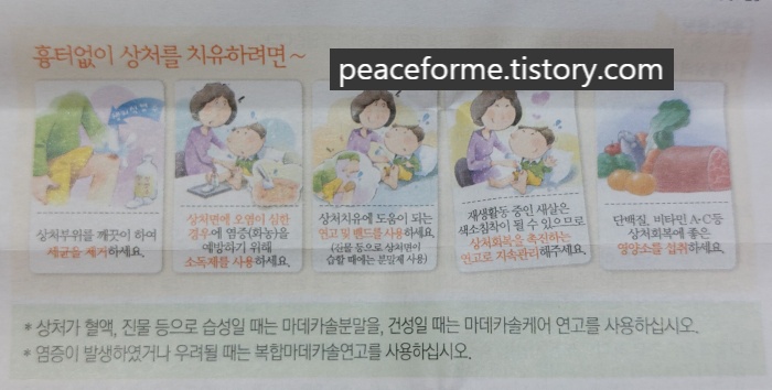 뿐만 아니라 연고 바를 땐 상처부위를 깨끗이 하여 세균을 제거하는 것이 먼저, 오염이 심한 상처의 염증 예방에는 소독제 사용이 동반되어야 한다는 점과 함께 상처회복에 좋은 영양소 섭취 또한 흉터없는 피부 재생을 위한 길임을 알려줘서 이해가 갔다.