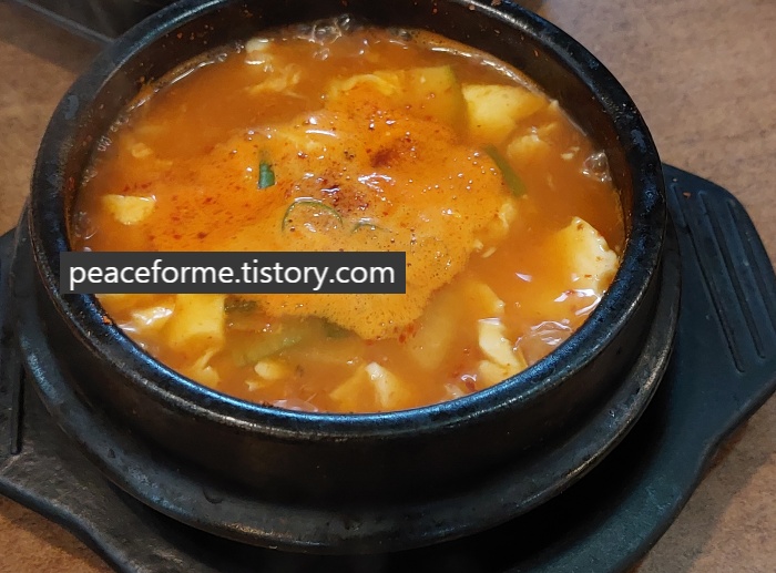 적당히 매콤한 풍미를 자랑하던 순두부 찌개도 입맛에 잘 맞았다. 보글보글 끓는 상태로 등장한 뚝배기에 아낌없이 넣은 순두부가 넉넉하게 들어가 있던 점도 흡족함을 더했다.