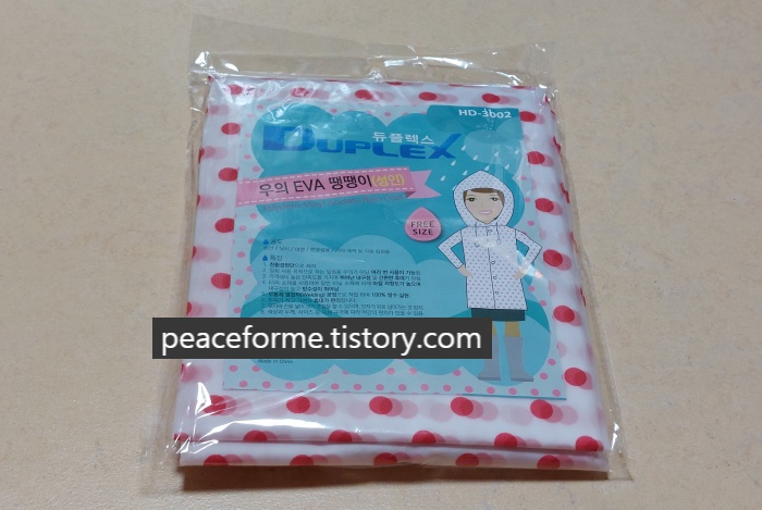 저렴한 가격에 급하게 구입했지만 필요한 순간마다 구세주로 활약 중인 듀플렉스 EVA 땡땡이 우의는 방수 잘 되는 다회용 성인 우비로 본분을 다하는 중이라 계속 잊지 않고 챙겨서 갖고 다니려고 한다. 비오는 날 외출하기 전에 미리 입고 나가면 이보다 더 좋을 순 없다. 특히, 대학로에 공연 보러 갈 때 많은 도움이 되고 있다.