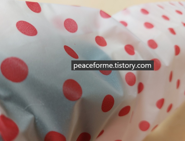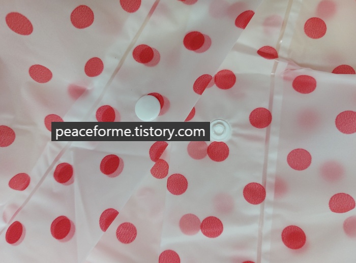 듀플렉스 EVA 땡땡이 성인 다회용 우비 색상은 블루, 핑크, 옐로우 이렇게 세 가지로 구성되어 있다고 표기된 설명이 포착되었는데, 내가 산 우의는 레드였다. 그러니까 레드 컬러를 핑크 컬러로 지칭했다고 봐도 무방할 듯 하다. 화이트 컬러 베이스에 레드 도트 무늬가 빼곡한 레인코트와 다름 없었다.