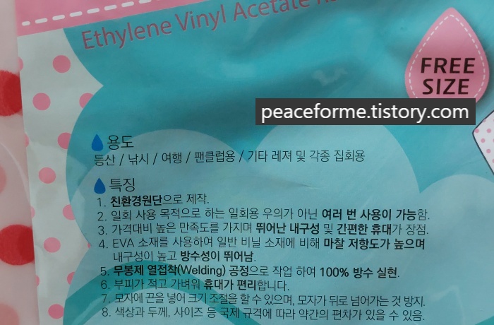 뿐만 아니라 EVA 소재를 활용함으로 말미암아 일반 비닐 소재에 비하여 마찰 저항도가 높고 방수성이 탁월하다고 해서 이 점도 고개를 끄덕이게 만들었다. 무봉제 열접착 공정으로 작업해서 100% 방수 실현, 부피가 적고 가벼움과 동시에 모자에 끈을 넣어 크기 조절이 가능하다는 내용 또한 눈여겨 볼만 했다.