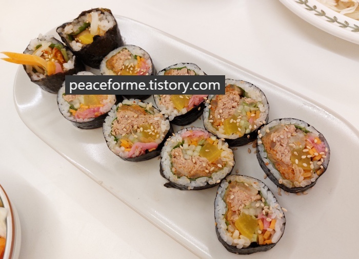 볶음김치참치 김밥은 참치와 볶음김치를 메인으로 깻잎, 단무지, 적채, 오이 등이 듬뿍 곁들여진 것이 남다른 비주얼을 뽐냈다. 특히, 볶음김치와 참치가 어우러짐으로써 매콤한 부드러움이 입 안을 감싸는 풍미가 나쁘지 않았다.