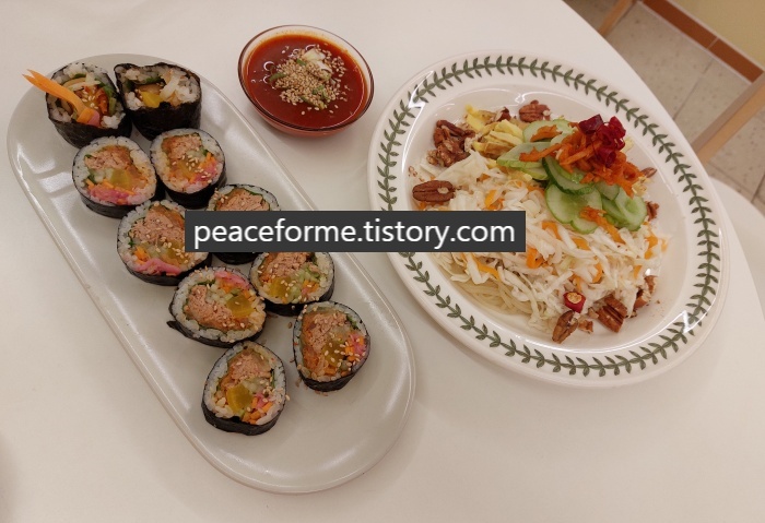 부부김밥에서 주문을 통하여 맛본 메뉴는 볶음김치참치 김밥과 야채가득 비빔쫄면이었다. 김밥 같은 경우에는 1,000원을 추가로 지불하면 밥 대신 계란으로 대체하여 키토 김밥을 먹을 수 있었고, 야채가득 비빔쫄면은 사과고추장소스와 새콤달콤간장소스 중에서 고를 수 있다는 사실을 확인함에 따라 선택의 폭이 넓은 것이 장점이라고 봐도 무방했다.