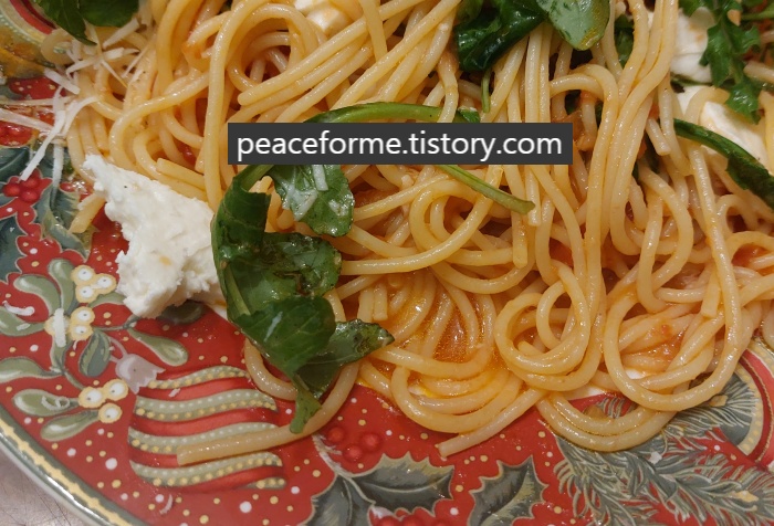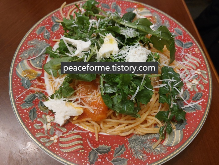 두 번째 메인 메뉴는 이탈리아 말로 크리스마스를 뜻하는 단어 '나탈레(natale)'를 따와서 이름을 붙인 나탈레 스파게티였다. 빨간 토마토, 녹색 루꼴라, 하얀 모짜렐라 치즈로 완성시킨 삼색 스파게티는 크리스마스와 더불어 이탈리아 국기 색깔 레드, 그린, 화이트를 덧입힌 음식으로 화사함을 뽐내서 눈길이 갔다.