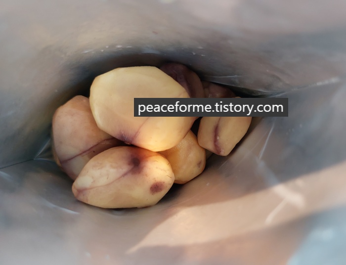 포장을 뜯어서 맞닥뜨리게 된 공주 알밤의 양은 앙증맞기 그지 없었다. 그 속에서 밤 표면의 수분은 제조과정시 생기는 것이며 검은 부분 또한 밤 내피의 일부분이니 안심하고 취식 가능하다고 해서 고개가 끄덕여졌다. 밤 껍질을 깔 필요 없이 수월하게 한 입거리로 먹기 좋은 것이 이 제품의 장점이었다.