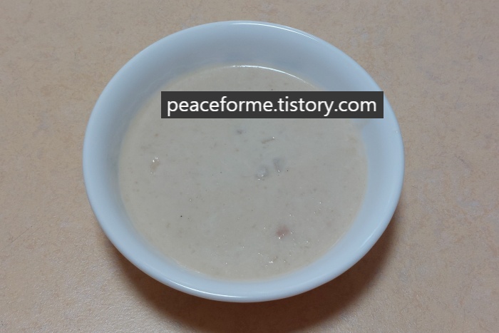 스프의 국물 자체는 적당히 점성이 있으면서도 묽은 편에 속했다. 그리고 맛 자체는 심심함을 접하게 도왔는데, 이러한 이유로 짜지 않아서 좋았다. 부드럽고 담백한 맛이 자극적이지 않아 마음에 들었던 것이다. 혹시라도 입맛에 따라 많이 싱겁게 느껴진다면 후추를 곁들이는 것도 나쁘지 않겠다 싶었다.