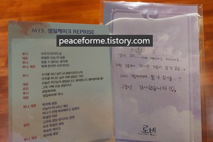 가사지 뿐만 아니라 티켓 수령할 때 캐스트별 굿바이엽서까지 증정받게 돼 이 점도 흡족했다. 뮤지컬 <로빈> 재연은 2023년 올해 들어 관극하면서 제일 많이 울면서 본 공연이 되었다. 4월 기준으로 아직까지는.