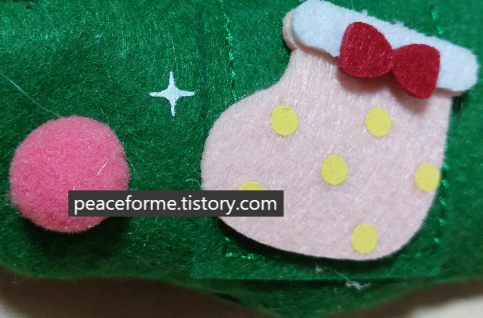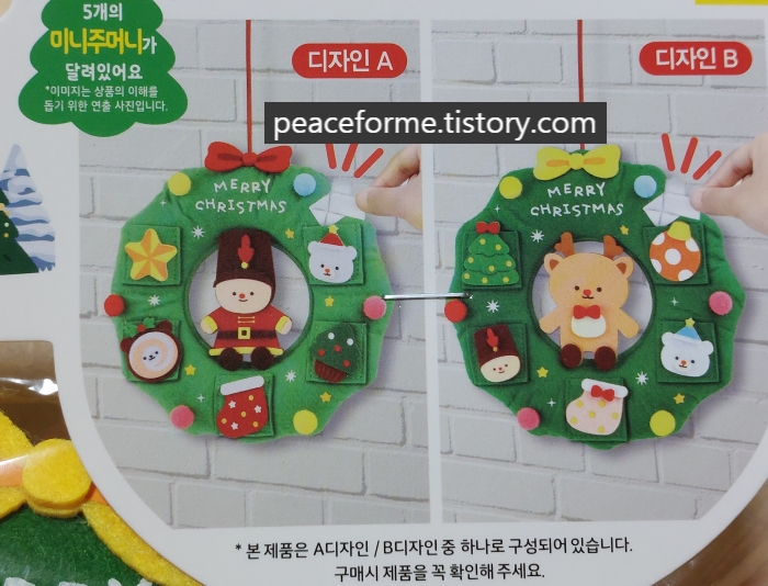 다이소에서 만나볼 수 있었던 크리스마스 펠트 장식 리스는 디자인 A와 디자인 B, 이렇게 두 가지 종류가 판매 중이었다. 이중에서 내가 고른 건 디자인 B였는데, 포장된 제품 중에서 상태가 괜찮은 걸 선택하다 보니 그렇게 됐다. 둘 중 아무거나 사도 상관이 없었던지라 여기에 집중했음을 밝힌다.