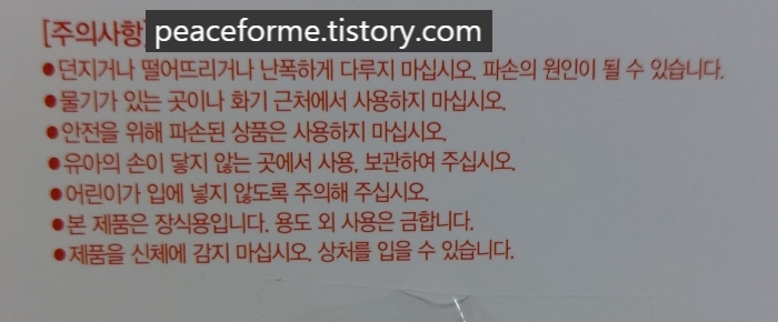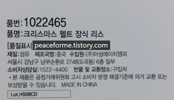 주의사항으로는 장식용이므로, 용도 외의 사용을 금한다는 내용이 중심을 이루고 있었다. 크리스마스 리스는 아무래도 벽걸이용으로 사용하는 소품이라서 물기 및 화기가 없는 곳을 피하여 잘 걸어두면 될 것으로 보여졌다.
