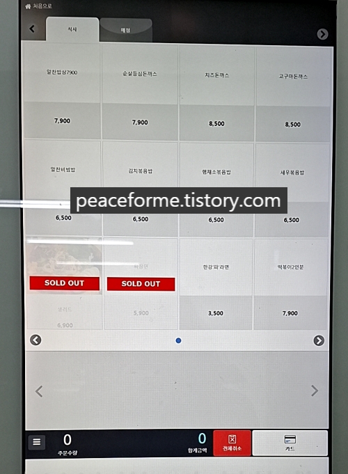 키오스크에는 앞서 문에 붙어 있던 것보다 음식이 더 많이 준비되었음을 일깨워줘 흥미로웠다. 돈까스 같은 경우에는 7,900원짜리 순살등심돈까스와 8,500원짜리 치즈돈까스와 8,500원짜리 고구마돈까스로 나누어져 있었다. 볶음밥은 6,500원으로 가격은 같았으나 김치볶음밥, 햄채소볶음밥, 새우볶음밥 중에 고를 수 있어 이 또한 눈여겨 볼만 했다. 이외에 6,900원짜리 샐러드와 5,900원짜리 짜장면은 솔드 아웃이라고 표기된 상태였다.