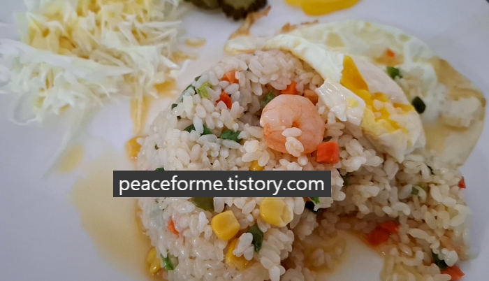 새우볶음밥에는 새우, 옥수수콘, 당근, 파 등이 어우러짐과 동시에 계란후라이가 곁들여져 고소함이 극대화되었다. 게다가 양배추 샐러드 소스가 망고 드레싱이라서 이로 인한 달콤함도 입 안을 즐겁게 만들어 줄 때가 없지 않았다.