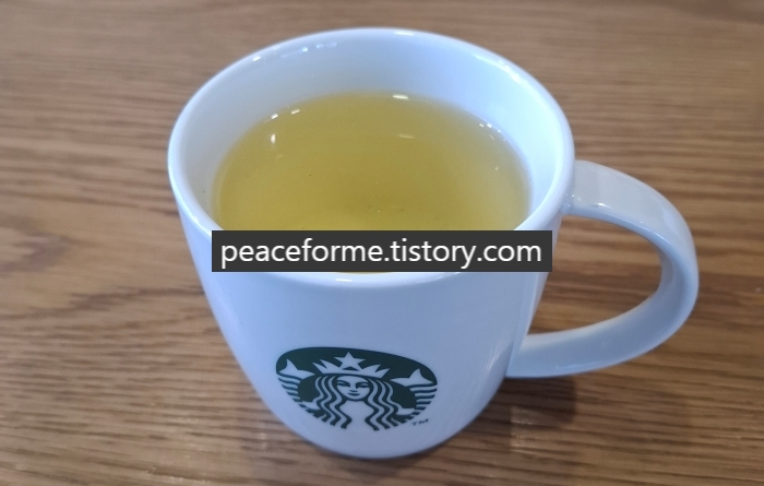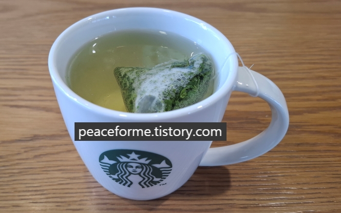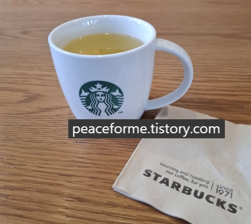 음료의 사이즈가 톨과 벤티로 나누어져 선택할 수 있었기에, 나는 톨을 골랐다. 온도는 아이스 말고 핫으로. 그리하여 잠시 후에 만나볼 수 있었던 차의 비주얼은 이랬다. 녹차 티백이 따끈한 물 안에 담김으로써 차의 색감이 변화해 가는 모습을 지켜보는 재미가 쏠쏠했다.
