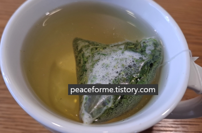다만, 차의 맛이 은은하기보다는 꽤나 강렬함을 자아냈으니 이 점을 머리 속에 넣어두어야 하지 않을까 싶다. 티백에 포함된 상당한 양의 찻잎이 존재감을 뿜어내며 제대로 빛을 발했다고 봐도 무방했다. 덧붙여 제주 유기농 녹차로 만든 티의 칼로리는 0kcal일 뿐만 아니라 다른 영양성분의 함량 역시도 0에 수렴하지만, 카페인이 16mg 포함된 음료임을 잊어서는 안되겠다.