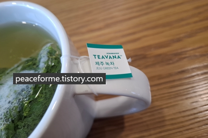 이와 함께 제주 유기농 녹차로 만든 티에 사용되는 티백이 스타벅스 티바나 제주 녹차임을 확인하는 일 또한 어렵지 않았다. 찻잎으로 가득 채워진 티백의 위엄이 남달랐는데, 티백을 우리는 적정한 시간이 3분이라고 해서 음료를 받아오고 얼마 지나지 않아 티백을 머그컵에서 건져냈다.
